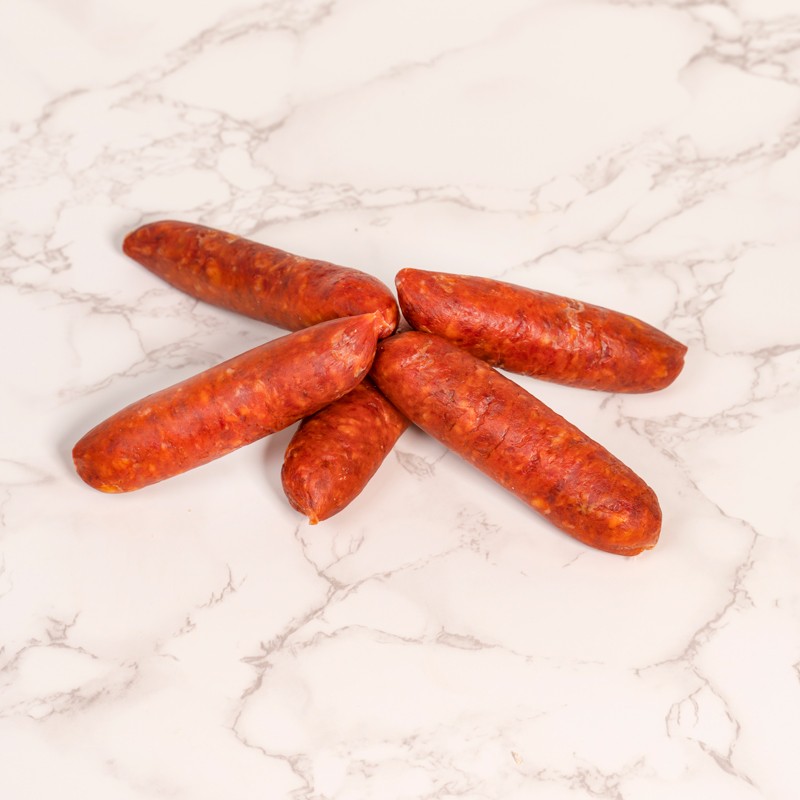 El chorizillo artesano es un producto elaborado con carne de cerdo magra y panceta de cerdo, adobado con pimentón que le hace ser un producto ideal para ser consumido en formato individual, tanto frito, asado, a la brasa o cocido.
